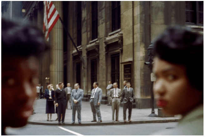In this photograph, my initial reaction is the separation between colour. I don’t know if this was deliberate, or was a consequence, but it seems like separation of the people. The way how the only people looking back are the dark tone women is interesting. It could imply that the white businessmen and women won’t listen or look their way. As they are blurred, this could mean that back in that time, society pushes them to the back. This links as there is an American flag hanging, meaning that this building is where people perhaps have good, well-paid jobs. And the sense that the reason why the women are looking back is that they don’t have good jobs.