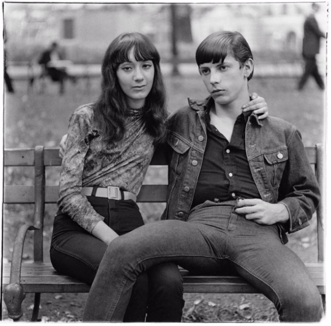 In this image, Arbus has taken a candid portrait image of a couple. This couple seems typical, but as you start to look closer, perhaps you start to see that the women isn’t happy or comfortable around the man. From the position of her hand and the distance of her pulling away from the man, she seems awkward. But on the other hand, the man is dominant as he has his leg on top of her, this could imply that he controls the relationship. As he also doesn’t make eye contact with the camera, he seems less approachable than the woman, and angrier. I like the use of selective focus on the couple, as it blurs the background it gives the people more movement, as they walk past them. Sometimes it good to show people like this, because the street is not always full up of happy people.