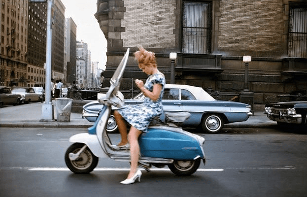 In the image, Joel Meyerowitz has taken an image of a woman on a scooter, amid New York City. What’s fascinating is that the woman is more worried over her looks than her safety. She is stopped in the middle of the road to check her nails. There may have been a red light in front of her, which could have been a possibility. But also by the way she dressed, she is wearing a dress in heels. Which implies that she is not worried about the danger of herself, because heels are not the safest shoes to drive in, also stopping in the middle of the road is dangerous as well.