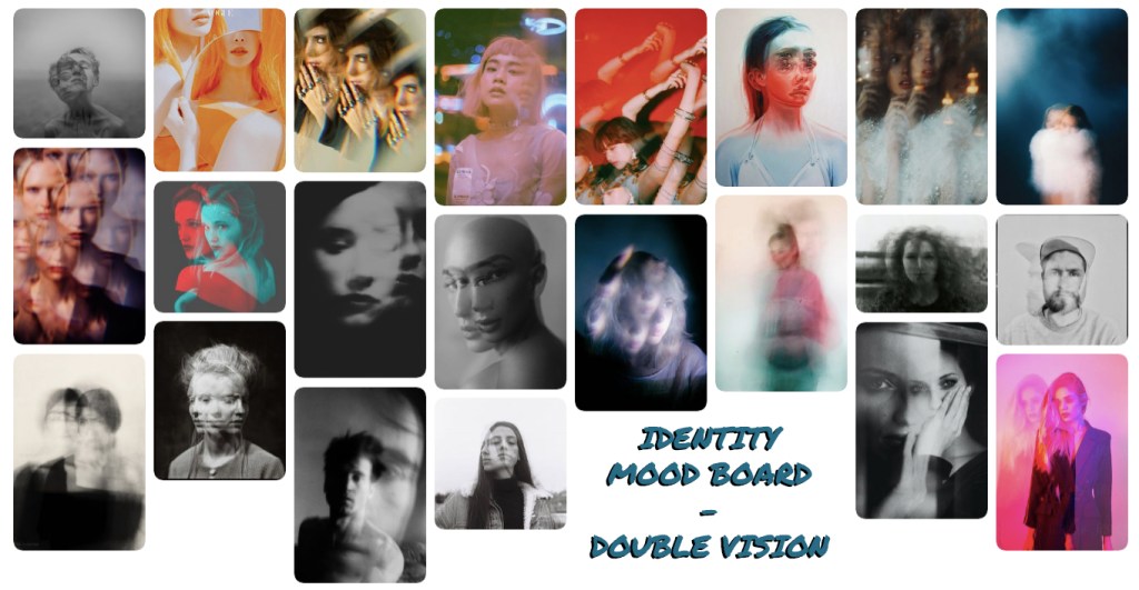 But the question is what am I photographing. Is it my own environment, family member or friends. Even photographing them outside or within my home. But maybe past events that have happened due to my double vision. Recreating them for my final images, showing my 1st point of view perspective. I will do test shoots & research, learning how to do the technique of multiple exposures.