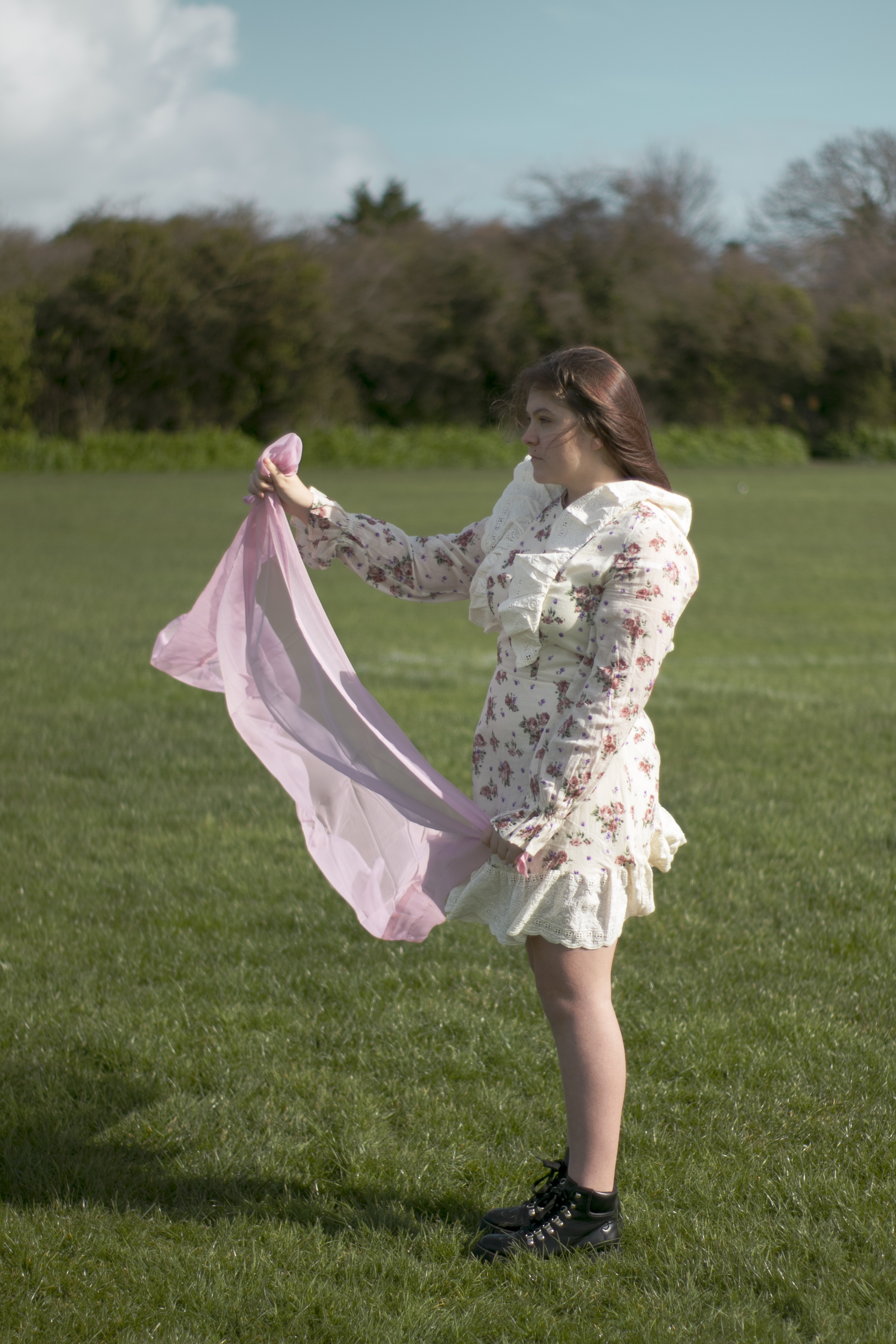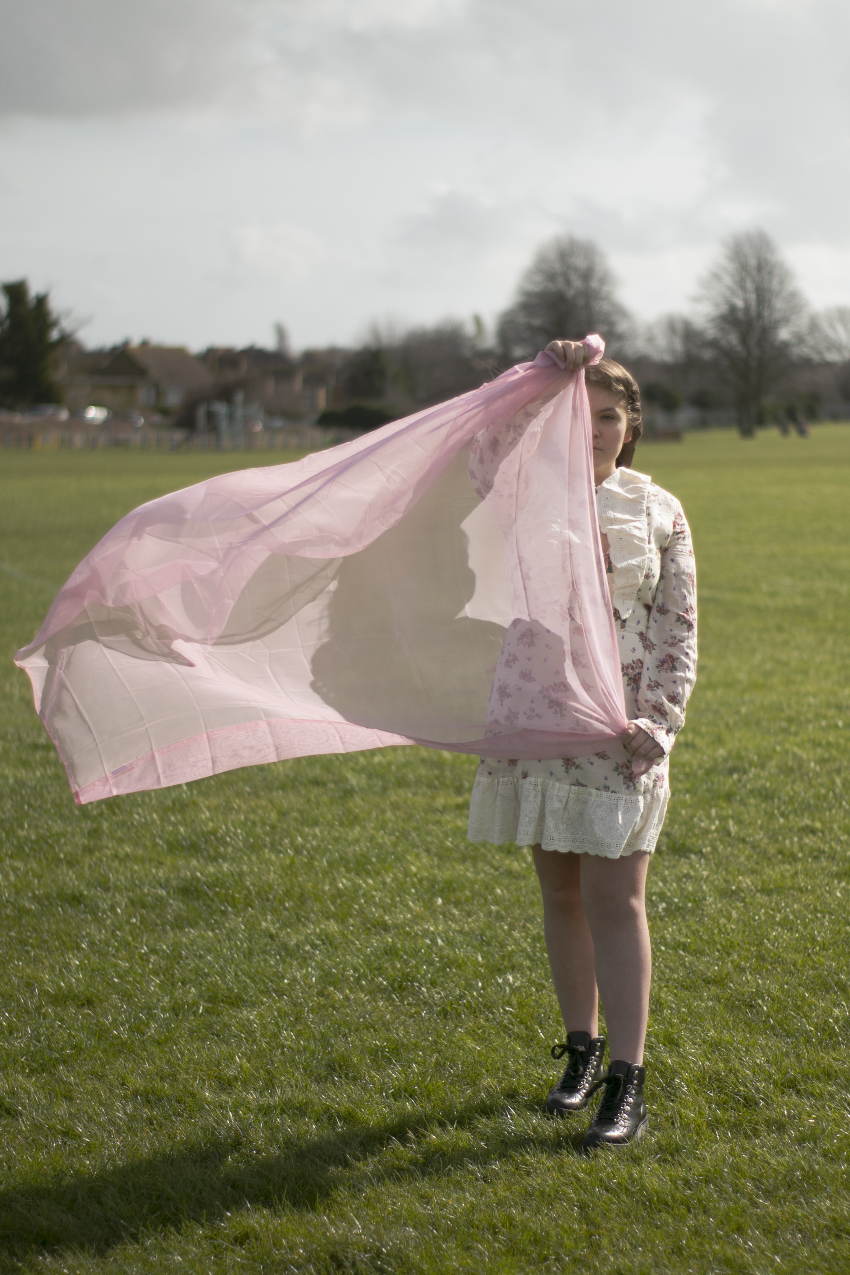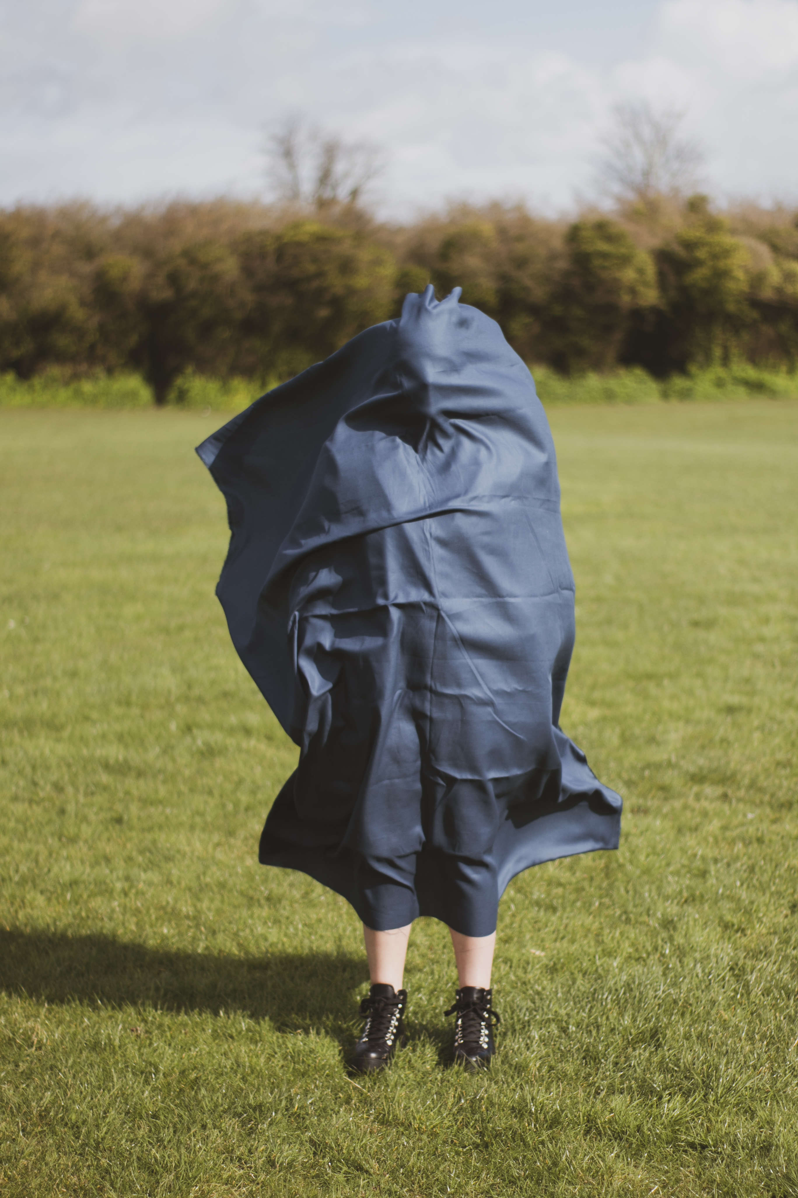 The shoot was a lot harder than I thought; the wind went in different directions, which made the timing/angles of the material hard to take. The weather was constantly changing, which made the condition harder, as well. When positioning the model and the fabric to how I wanted it, the wind moved it straight away, so I had to be quick enough and have communications between the model and me. The blue fabric happen by accident, I let go of it and few into her face, almost like the scene in movies when the newspaper lands in someones face. So I place it in position, and this is how it turned out.
